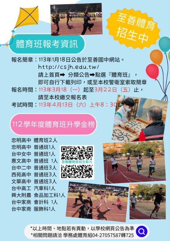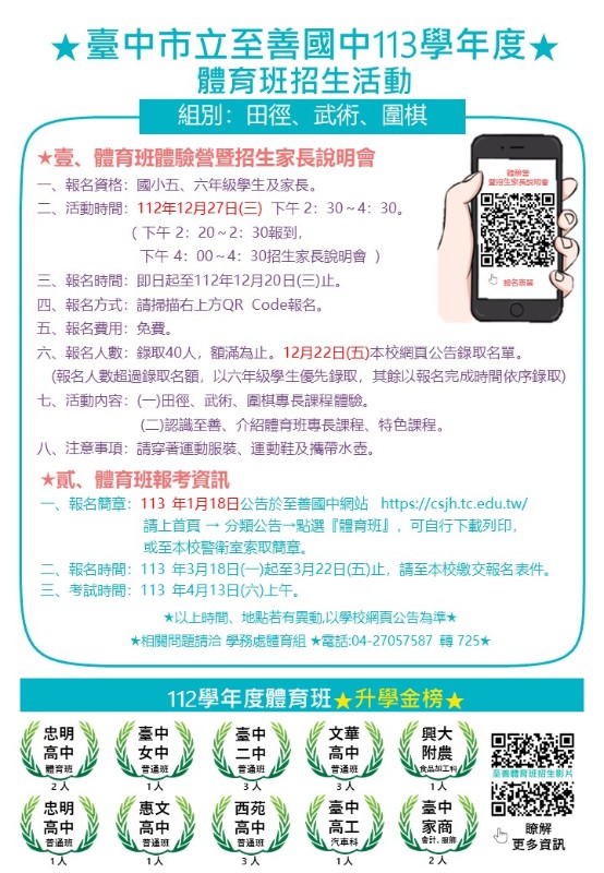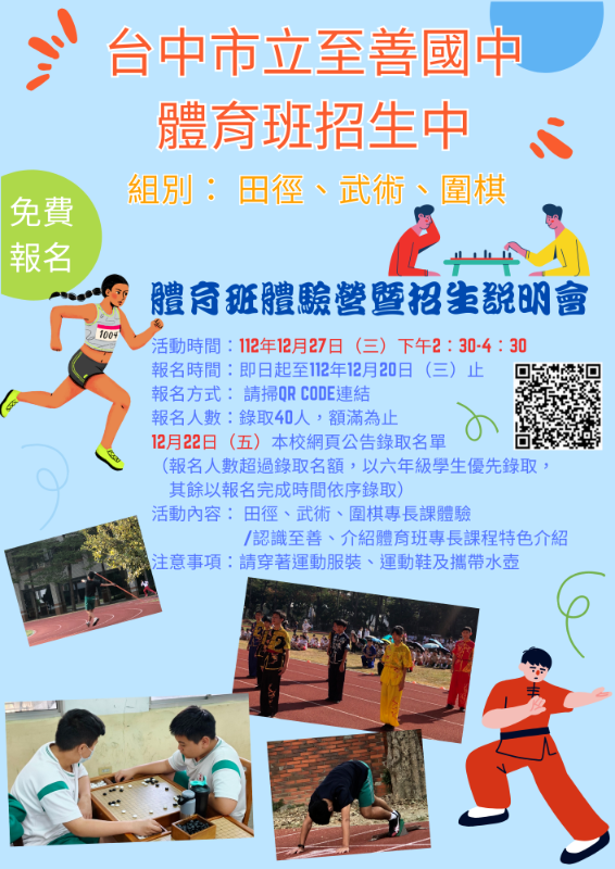 一、體育班招生項目:圍棋、武術、田徑二、體育班體驗營時間:112年12月27日(三)下午2:30 ~ 4:00。三、體育班家長說明會時間:112年12月27日(三)下午4:00 ~4:30。四、體育班體驗營報名時間:即日起至112年12月20日(三)。五、體育班體驗營及家長說明會報名方式:(一)請掃「臺中市立至善國中113學年度體育班招生活動資料」QR Code報名。(二)請上臺中市至善國中網站首頁https://csjh.tc.edu.tw/ → 分類公告 → 體育班 → 選擇「臺中市立至善國中113學年度體育班招生活動」公告 → 按連結掃QR Code報名。