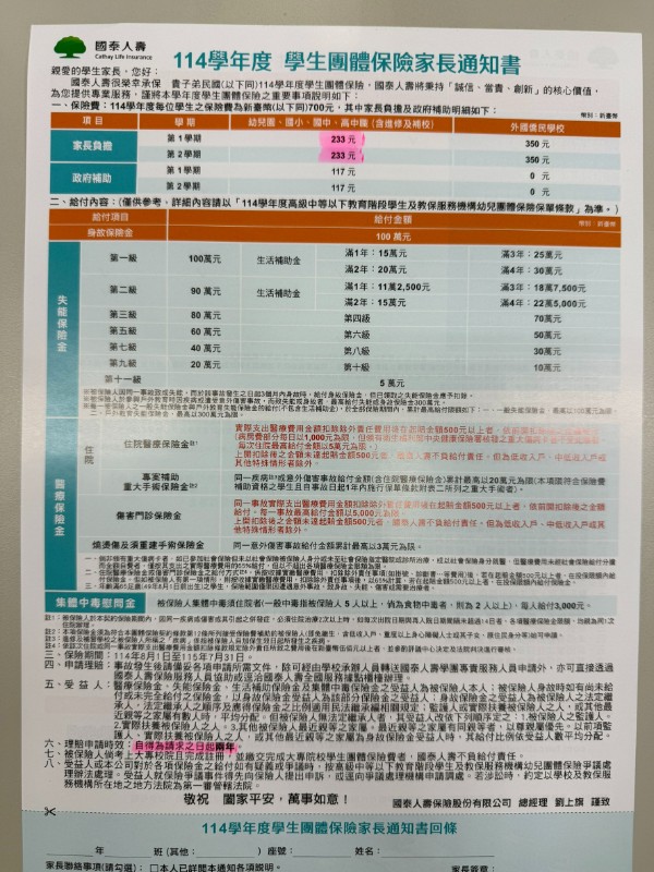 【114學年度學生團體保險通知書】