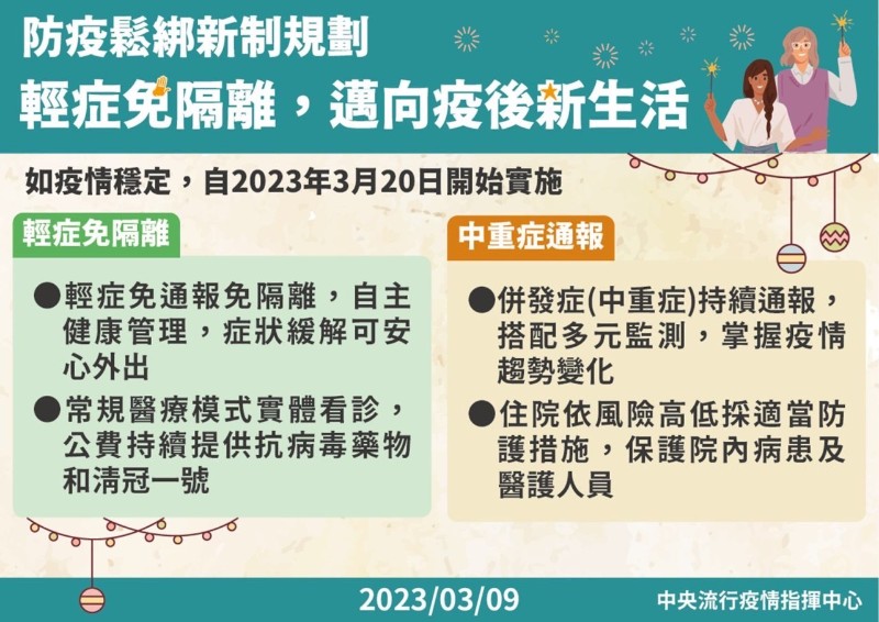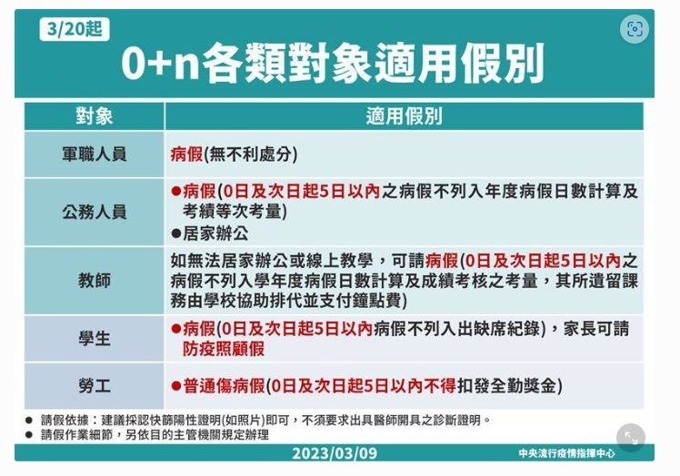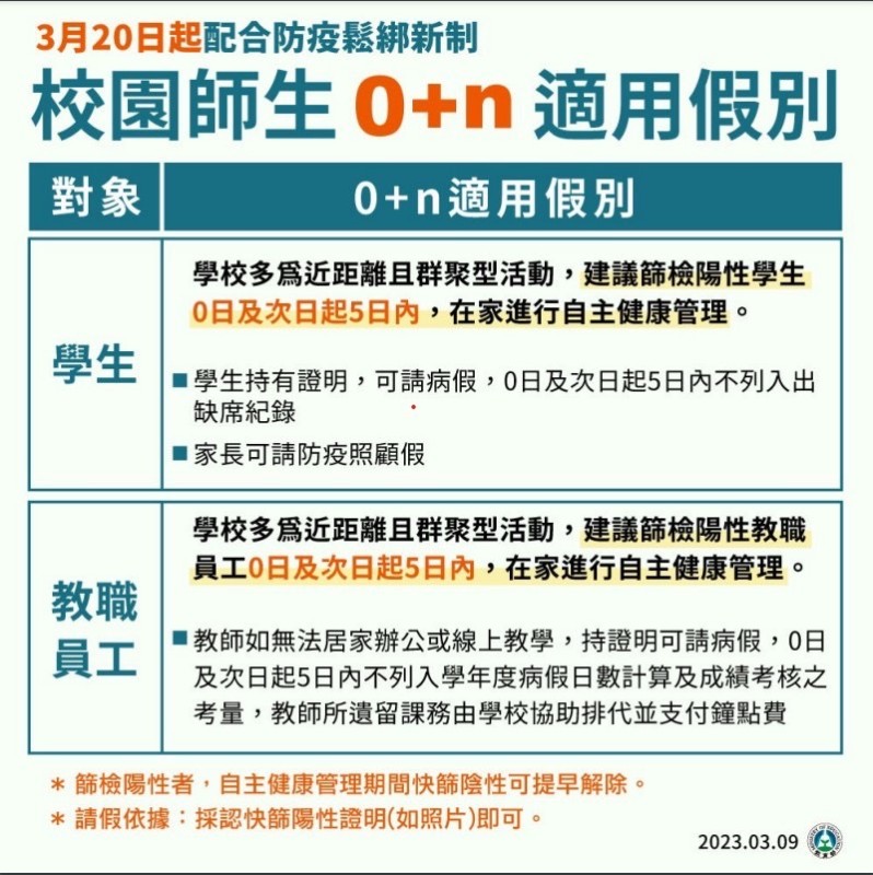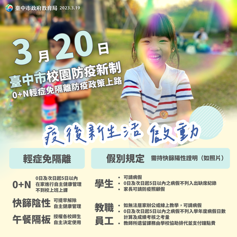 3月20日學校因應因應嚴重特殊傳染性肺炎防疫管理指引~~ 一、配合中央流行疫情指揮中心及教育部公告3月20日起實施輕症免隔離政策,臺中市各級學校及幼兒園自同步實施校園防疫新制,COVID-19篩檢陽性輕症或無症狀學生及教職員工,0日及次日起5日以內在家進行自主健康管理,不要到校上課上班,快篩陰性可提早解除自主健康管理。 二、考量學校多為近距離且群聚型活動,建議COVID-19篩檢陽性輕症或無症狀學生及教職員工,0日及次日起5日以內在家進行自主健康管理,不要到校上課上班,快篩陰性可提早解除自主健康管理。 三、在假別規定方面,學生持快篩陽性證明(如照片),可請病假,0日及次日起5日以內病假不列入出缺席紀錄;家長在學生前述天數病假期間,可請防疫照顧假。 四、午餐隔板部分,考量疫情已逐步趨緩,授權各班師生自主決定使用午餐隔板。 五、校園健康監測與通報、環境清消、教室保持通風及備妥充分防疫物資等常規防疫工作仍會落實執行,避免校園群聚疫情發生。