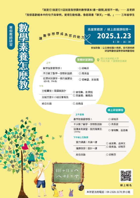 | 敬邀 貴校協助宣傳「2025寒假國小教師研習—數學素養怎麼教?」並鼓勵教師參加,敬請同意。 |