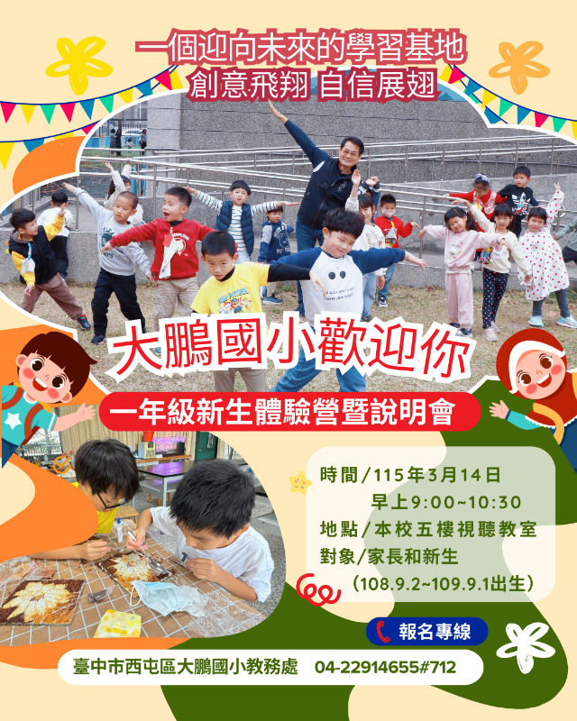 大鵬國小小一新生體驗營暨說明會 時間:115.3.14(六) 9:00~11:00 活動流程: 9:00~9:20 活動報到(請於辦公室前走廊報到) 9:20~11:00 學校特色與招生說明/小一新生闖關活動體驗/新生入學報名 11:00~ 雙語課後照顧班課程說明會 活動當天, 請小一新生攜帶水壺; 家長可攜帶戶口名簿正本及影本辦理新生入學報到。