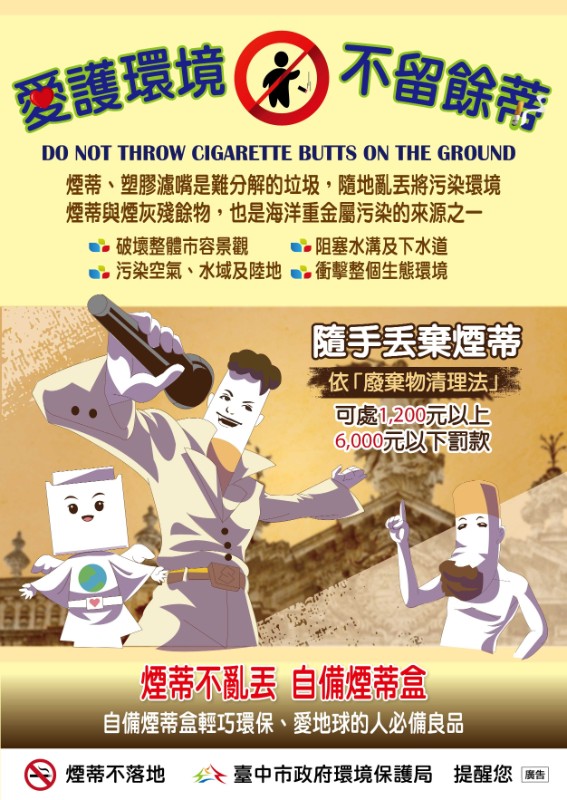 配合臺中市環保局宣導煙蒂不落地觀念: 「不亂丟煙蒂,共創好環境, 違者最高可處新臺幣6,000元, 臺中市政府環境保護局關心您。」