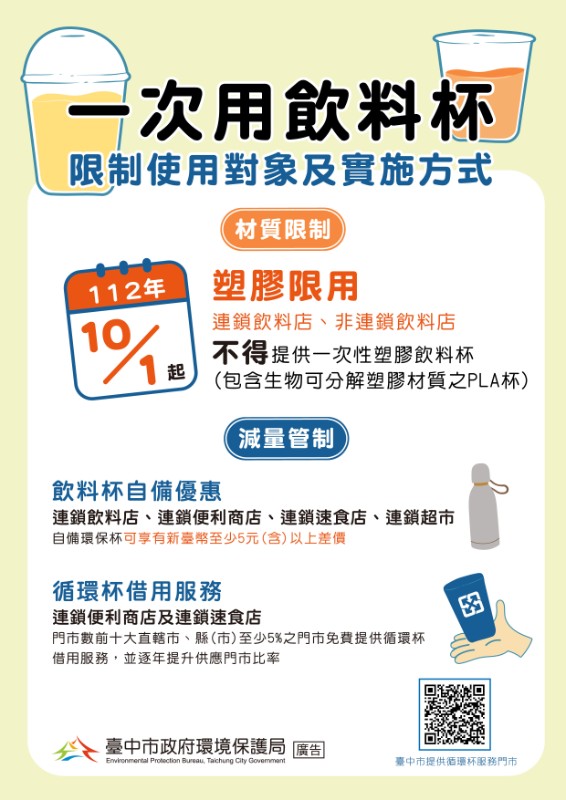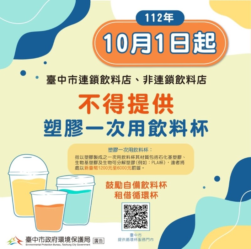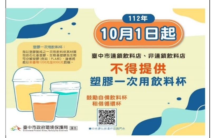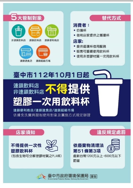 | 標題 | 限塑新政策~臺中市自 10 月 1 日起飲料店不得提 供塑膠一次用飲料杯,請「自備、重複、少用」 綠消費好習慣,環保局關心您。 |