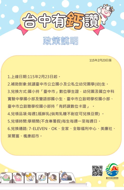 說明: 一、依據本局114年11月13日中市教課字第1140106957號函及 114年12月11日中市教課字第1140115037號函續辦。 二、配合數位化、無紙化的時代趨勢,旨揭計畫結合本市數位 學生證與超商(市)通路合作,採用數位方式讓學童至合作 通路兌換乳品,藉以減輕學校行政作業負擔。補助對象及 細部執行方式說明如下: (一)補助對象:就讀本市公立國小(含特教學校國小部)、公立 國小附設幼兒園、市立幼兒園、區立幼兒園、私立幼兒 園、非營利幼兒園、職場互助教保服務中心之學(幼) 生。 (二)兌換方式: 1、公立國小:持本市數位學生證至合作通路超商(市)兌換 乳品。 2、無數位學生證公立國小:持本局指定之有鈣讚數位卡證 至合作通路超商(市)兌換乳品。 3、公私立幼兒園(含職場互助教保服務中心):持本局指定 之有鈣讚數位卡證至合作通路超商(市)兌換乳品。 (三)兌換頻率:於學期間每生每週一至每週日可至合作通路超 商(市)兌換1瓶鮮乳(倘有乳糖不耐症可兌換豆漿)。 (四)兌換通路:全臺統一超商(7-11)、全家超商、萊爾富超 商、來來(OK)超商、楓康超市、全聯福利中心及美廉 社。 (五)實施期間:114學年度第二學期開學至115學年度第一學期 結束止(自115年2月23日至116年1月24日止,不含寒暑 假),共計40週。