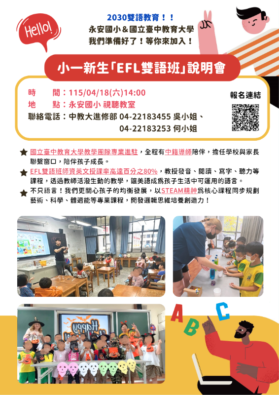 各位親愛的家長好: 西屯區永安國小與國立臺中教育大學即將攜手合作辦理EFL雙語班課程,為了讓您可以清楚了解課程上課模式,誠摯歡迎您4/18下午14點至永安國小視聽教室參加本班說明會,為掌握出席人數,請您撥冗點選以下連結並協助填寫資料