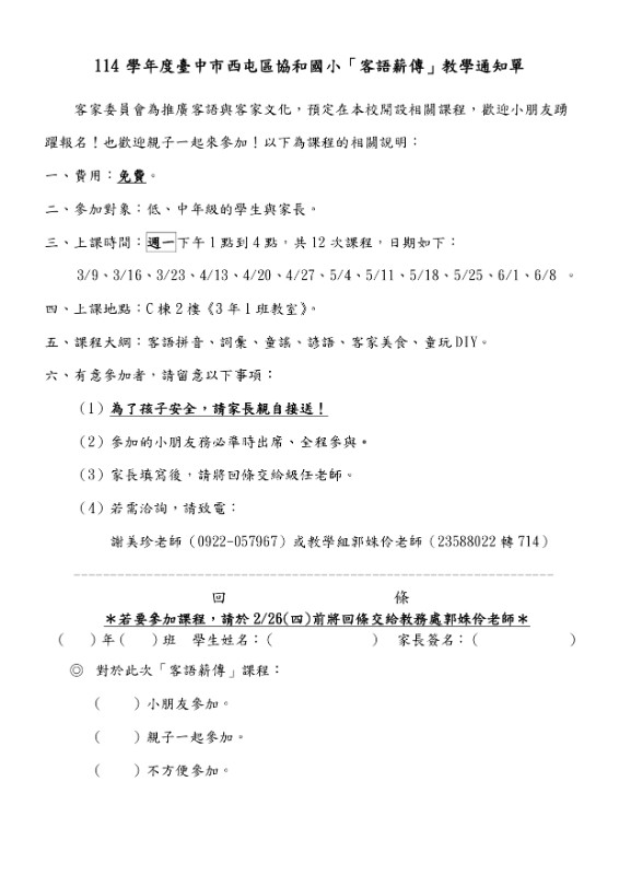 客家委員會為推廣客語與客家文化,預定在本校開設相關課程,歡迎小朋友踴躍報名!也歡迎親子一起來參加!以下為課程的相關說明: 一、費用:免費。 二、參加對象:低、中年級的學生與家長。 三、上課時間:週一下午1點到4點,共12次課程,日期如下: 3/9、3/16、3/23、4/13、4/20、4/27、5/4、5/11、5/18、5/25、6/1、6/8。 四、上課地點:C棟2樓《3年1班教室》。 五、課程大綱:客語拼音、詞彙、童謠、諺語、客家美食、童玩DIY。 六、有意參加者,請留意以下事項: (1)為了孩子安全,請家長親自接送! (2)參加的小朋友務必準時出席、全程參與。 (3)家長填寫後,請將回條交給級任老師。 (4)若需洽詢,請致電: 謝美珍老師(0922-057967)或教學組郭姝伶老師(23588022轉714) ✽若要參加課程,請於2/26 (四)前將回條交給教務處郭姝伶老師✽ |
