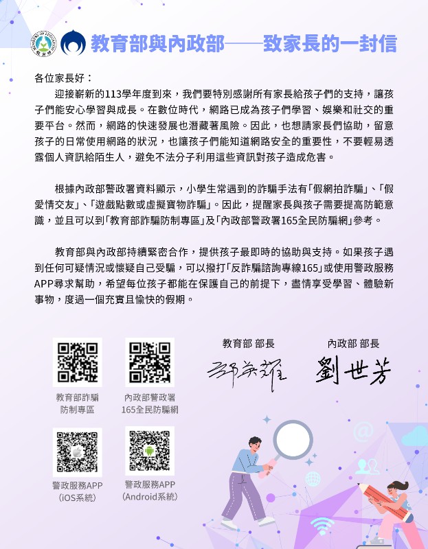 說明: 一、依據教育部國民及學前教育署113年8月8日臺教國署學字第1130089794號函辦理。二、為提升學生及家長之防詐知能,教育部與內政部共同製作致家長的一封信,提醒家長有關小學生及中學生常遇到的詐騙手法,並提供「教育部詐騙防制專區」、「內政部警政署165全民防騙網」及「警政服務APP」等相關參考資訊。