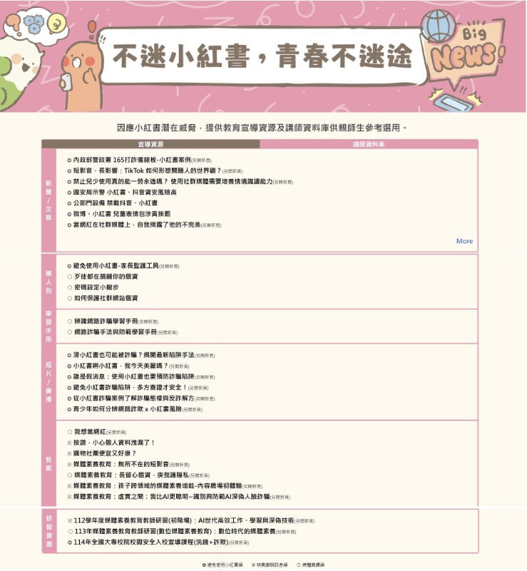 教育部建置「不迷小紅書,青春不迷途」專區(https://eliteracy.edu.tw/Shorts/xiaohongshu.html)