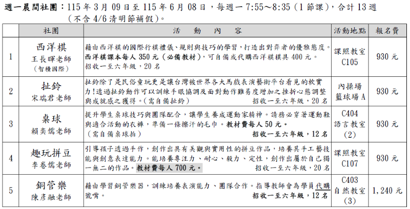 大仁國小114學年度第2學期-週一晨間暨週二課後學藝活動