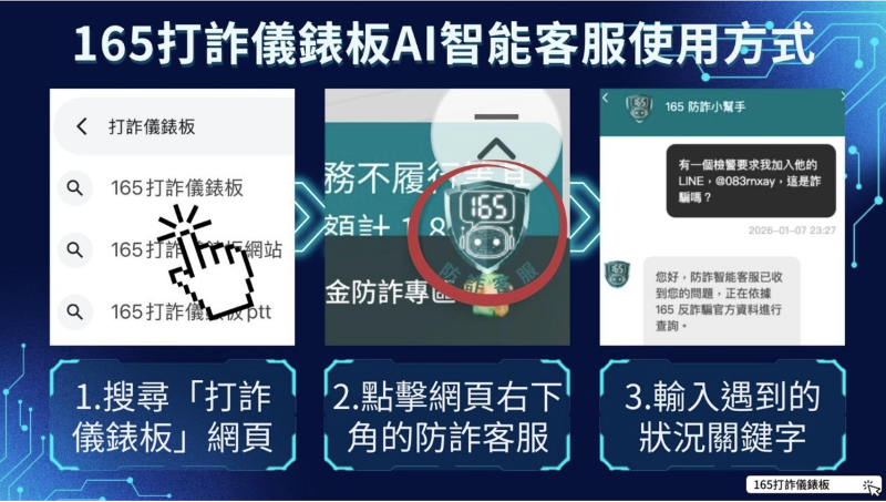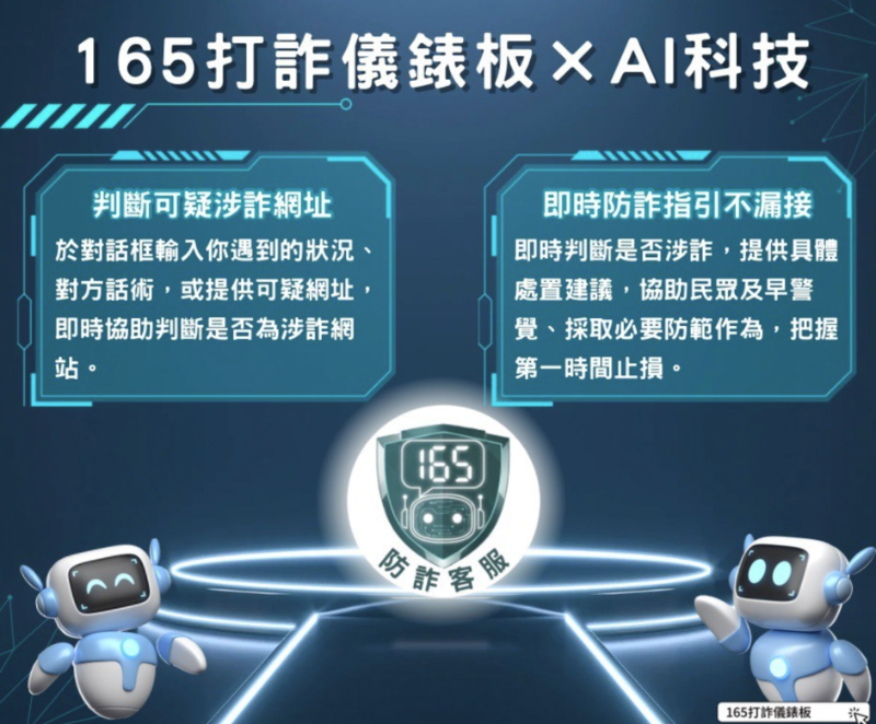 為因應詐騙手法快速演變,內政部警政署於「165打詐儀錶板」導入AI智能客服小幫手,整合防詐資料庫提供即時互動諮詢,可依民眾描述情境辨識詐騙風險並提供具體處置建議;另具備涉詐網址即時查詢功能,可判斷網站是否具詐騙風險。 |
