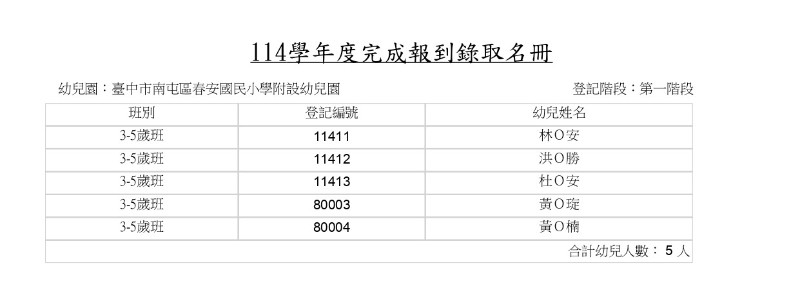 公告【春安附設幼兒園114學年度幼兒園第一階段正取名單】已全數報到完畢!