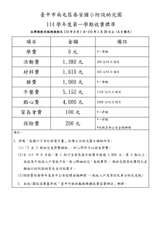 | 標題 | 幼兒園「114學年第一學期收費基準」公告 |