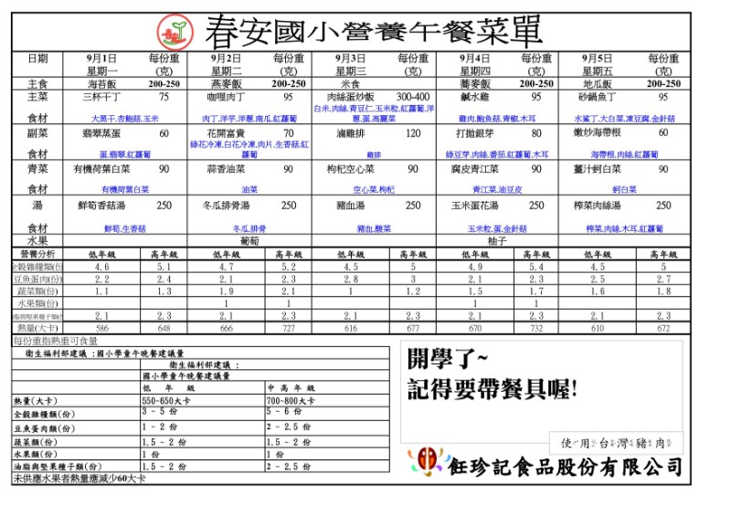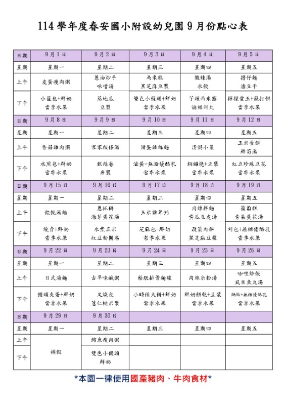 餐點表公告-114學年度第1週午餐與114.9月點心表
