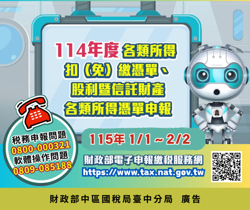 「114年度各類所得扣(免)繳憑單、股利暨信託財產各類所得憑單申報期限為115年1月1日至2月2日止,採用網路申報快速又便利。國稅局臺中分局 關心您」