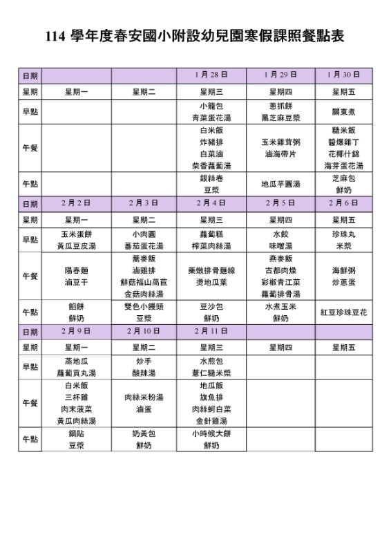 餐點表公告-114學年度寒輔餐點表