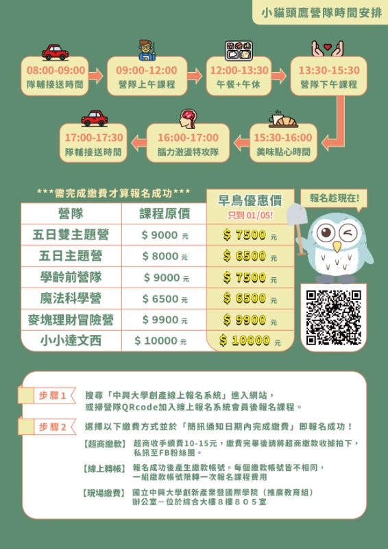 說明:一、由專業師資團隊授課,依托中興大學廣大有機生態校園與安全完善之教學環境,為寒暑假期間家長安心託付之優質選擇。二、「2026小貓頭鷹冬令營」規劃五日主題營共三梯次,課程內容豐富多元,包括:自然生態x生物透視、烘焙小職人、樂高創意、財商理財、甲蟲觀察、3D創客、麥塊冒險、魔法科學及小小達文西動手玩科學等。三、營隊課程及收費標準請詳閱營隊簡章(附件),惠請協助公告宣傳。報名方式至線上報名系統www.siileec.com。FB請搜尋:NCHUSMARTOWL;IG請搜尋:littleowl_nchu