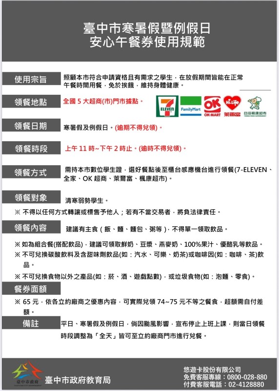 | 標題 | 114學年度第1學期例假日安心午餐券重要更新宣導、使用規範、超商兌領流程暨領餐內容 |