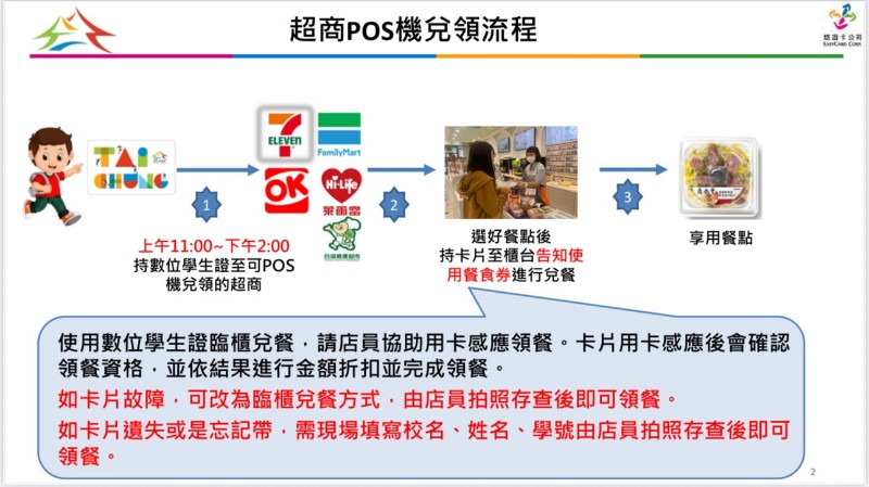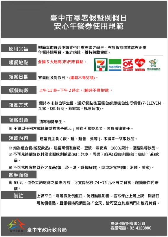 壹、114學年度第2學期安心午餐券使用規範暨領餐內容: (一)安心午餐券使用規範114學年度第2學期安心午餐券01使用規範.pdf (二)安心午餐券兌領流程114學年度第2學期安心午餐券02超商兌領流程.pdf (三)安心午餐券領餐內容114學年度第2學期安心午餐券03領餐內容.pdf (四)備註:倘平日、寒暑假及例假日,因遇天災(颱風)等不可抗力因素, 貳、114學年度第2學期安心午餐券重要宣導事項: (一)請學生欲兌換餐食時,務必攜帶學生證進行兌換。 (二)亦請學生及家長務必先將學生證拍下卡號或是記下卡號及學號,以利超商可操作兌換系統。 (三)學生於臺中市以外之外縣市僅能憑「學生證實體卡」兌換餐食,不得以卡號、學號或臨櫃填寫方式辦理兌換。 (四)因超商店員流動率高,學生兌換餐食時如遇店員不熟悉操作等情形,請改至鄰近合作超商兌換,並回報。 (五)請學生於兌換時主動告知店員係兌換「安心餐券」,以避免超商誤以悠遊卡一般消費方式結帳。 |
