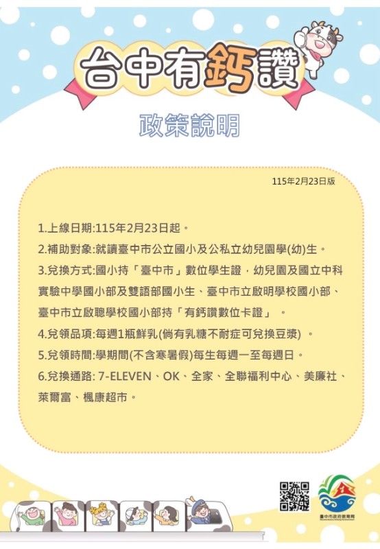 「台中有鈣讚計畫」 https://www.tc.edu.tw/page/4fe32a6d-7d0c-4b44-b131-b2b9ec2b094a 一、政策說明 (一)補助對象:臺中市公立國小及公私立幼兒園學(幼)生 (二)實施時間:114學年度第二學期,115年2月23日(一)起實施。 於學期間兌換,不含寒暑假115年2月23日~7月5日; 115年8月31日~116年1月24日,共計40週)。 (三)兌換方式:持本市「數位學生證」至合作通路超商(市)兌換乳品。 (四)兌換頻率:學期中每週兌換1瓶乳品(倘有乳糖不耐症可兌換豆漿)。 (五)兌換通路:統一超商(7-11)、全家超商、萊爾富超商、來來(OK)超商、 楓康超市、全聯福利中心及美廉社等7大通路。 (六)兌領流程: 步驟一:持數位學生證或有鈣讚數位卡證 步驟二:選擇可兌換鮮奶或豆漿 步驟三:到櫃檯向店員說: 「我要兌換『台中有鈣讚』」