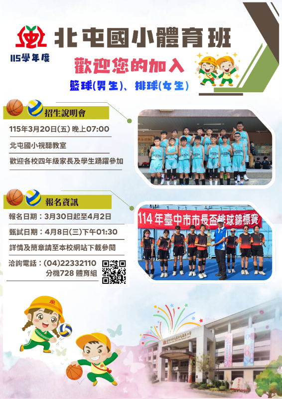 北屯國小115學年度體育班招生時程及簡章,歡迎四年級學生踴躍報考