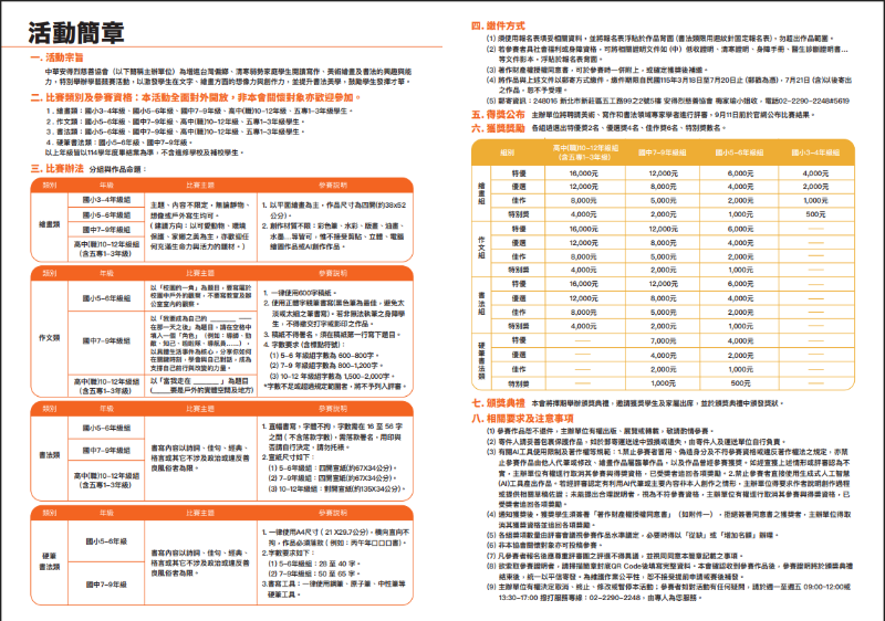 | 三、徵稿日期:自115年3月18日起至7月20日止,以郵寄方式繳交作品。收件人:梅家瑜小姐,收件地址:新北市新莊區五工路99之2號5樓。 |