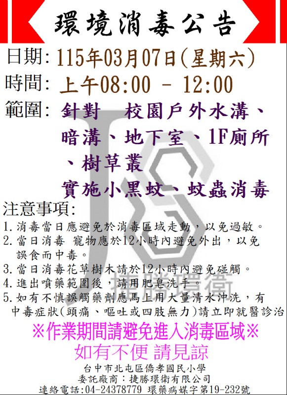 臺中市北屯區僑孝國民小學115年小黑蚊消毐公告-第一次-3月7日星期六