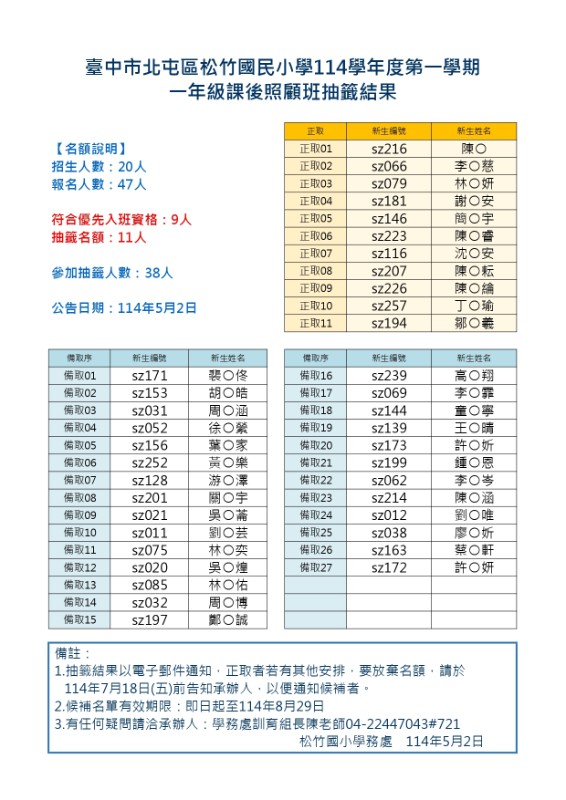 114學年度一年級課後照顧班抽籤結果如附件,請參閱。 1.抽籤結果另以電子郵件通知,正取者若有其他安排,要放棄名額,請於114年7月18日(五)前告知承辦人,以便通知候補者。2.候補名單有效期限:即日起至114年8月29日3.有任何疑問請洽承辦人:學務處訓育組長陳老師04-22447043#721松竹國小學務處 114年5月2日