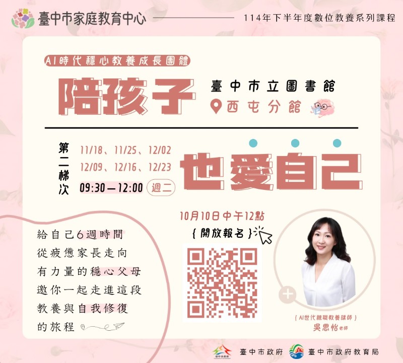 轉知家庭教育中心線上講座及11月至12月「AI時代穩心教養成長團體~陪孩子也愛自己」