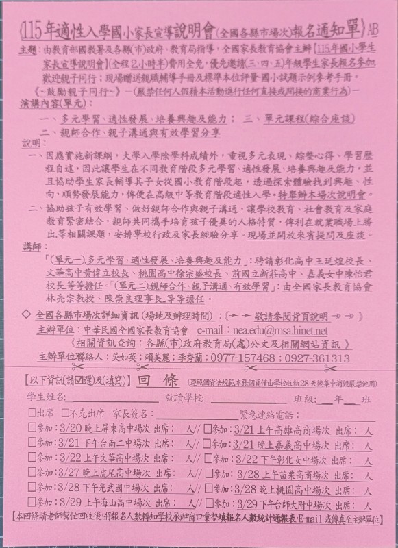 轉知全國家長教育協會主辦115年適性入學國小家長宣導說明會訊息