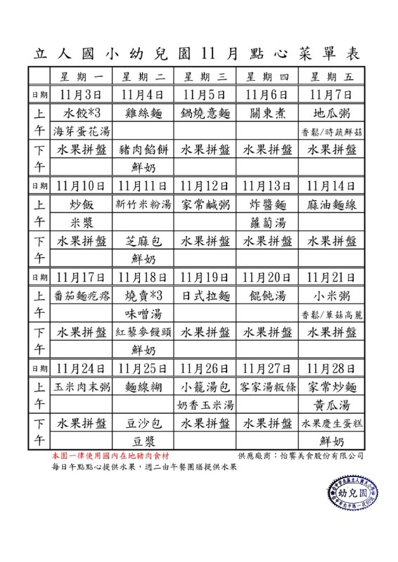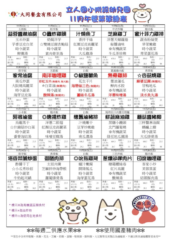 11/4 午餐湯品:肉骨茶湯調整為素肉骨茶湯 午餐菜單異動說明: 團膳公司:大同餐盒有限公司 已更新上方11月午餐菜單(紅字標示為更改菜色) 調整菜單如下: |