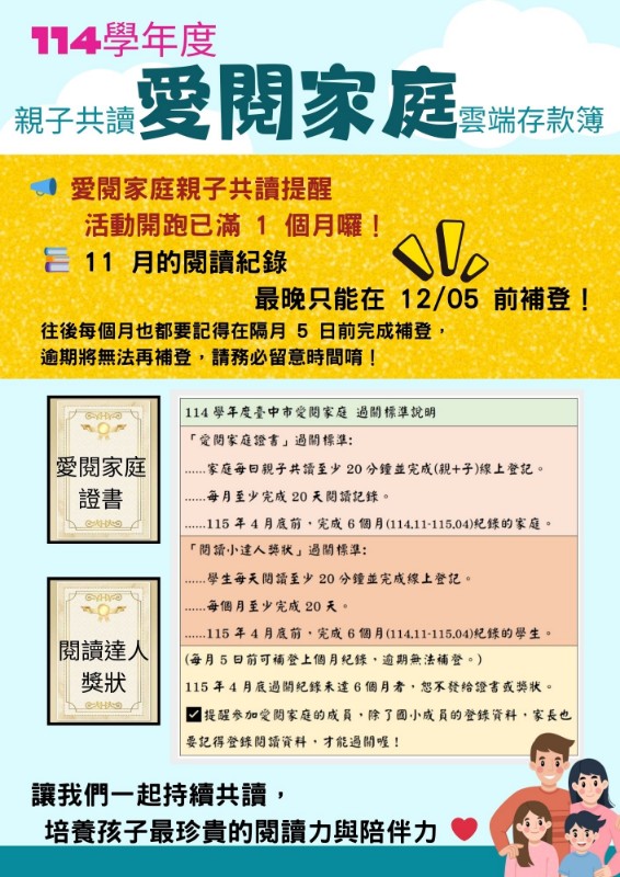 114年度臺中市親子共讀愛閱家庭 (11月補登提醒!!!!!)