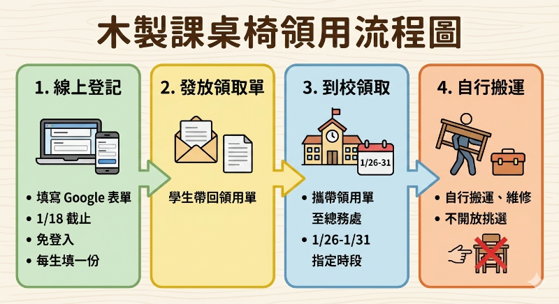 | 標題 | 台中市陪你長大~全面汰換學校課桌椅計畫,立人國小學生領用木製課桌椅申請方式 |