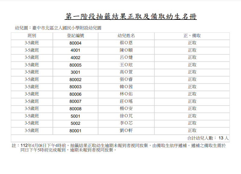 112學年度立人國小附設幼兒園新生登記入園第一階段抽籤結果