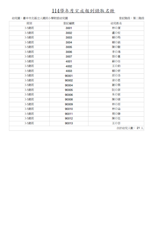 臺中市北區立人國小附設幼兒園114學年度第二階段完成報到錄取名冊