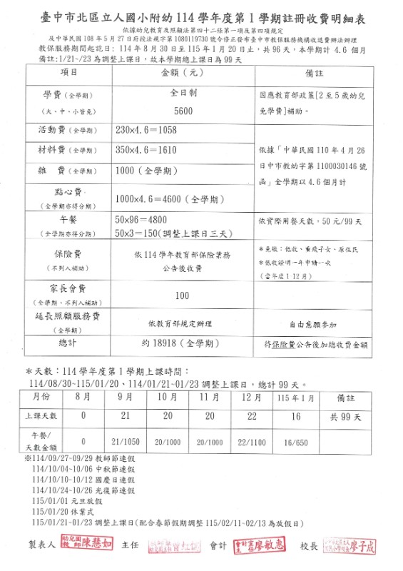 臺中市北區立人國小附幼114學年度第一學期註冊收費明細表