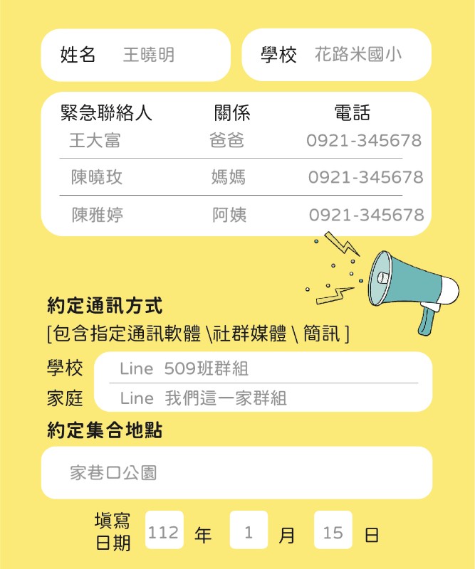 一、依據教育部112年2月10日臺教資(六)字第1122700521號函辦理。 二、內政部消防署「1991急難通信平臺」已於111年12月31日終 止服務,教育部校園災害防救計畫書及家庭防災卡涉及 「1991急難通信平臺」相關內容,將調整為災時約定通訊方式(通訊軟體、社群媒體或簡訊等方式),提供學校及家 長更多元聯繫管道,其修訂內容如下: (一)學校欄位:學校於災害發生時通知家長之約定通訊方 式,該約定方式應請學校統一制定,俾便對外通知家長,其中包含採用何種通訊軟體,以及設定通訊軟體群 組,於家長群組統一公告(班級群組或是全校對外官方 帳號),或以簡訊、社群媒體等多元方式告知家長。 (二)家庭欄位:學生本人在災害發生時聯繫家長之約定通訊方式,如網路暢通時,可採用通訊軟體;如網路不暢通 時,可採簡訊等方式聯繫。 ***本校學校欄位統一為各班級的LINE族群***例如:三年六班LINE家長族群 ***家庭欄位請學生家庭自組LINE族群*** ***請學年主任於學年採購聯絡簿時,務必通知廠商將原1991急難通信平台廢除,改成新式家庭防災卡***