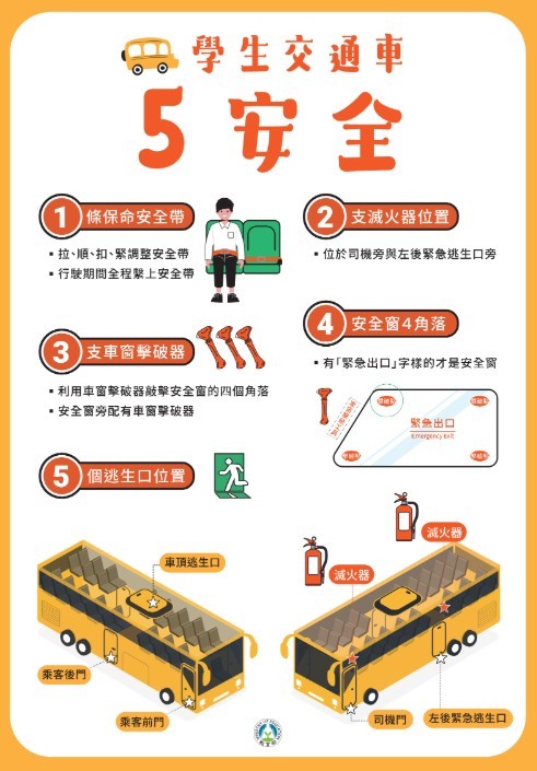 一、依據教育部國民及學前教育署(下稱國教署)114年2月5日臺教國署學字第1145800491號函辦理。 二、為維護學生搭乘安全,於戶外教育時,請依規定做好遊覽車安全檢查。於車上播放搭乘遊覽車安全影片及實際讓學生練習走安全門。 三、搭車相關安全教育,請見教育部學生交通車教育訓練教材、教學影片及圖卡(檔案下載連結https://reurl.cc/Re9z6g),供學校實施安全逃生演練、駕駛人員與隨車人員交通安全講習使用,以提升交通安全知能。 學生交通車(或搭遊覽車)乘坐注意事項及應變處理流程教學影片網址: https://drive.google.com/drive/folders/1Vi8qVJozqtPuobw6-VPELdnKEVgwNeyd