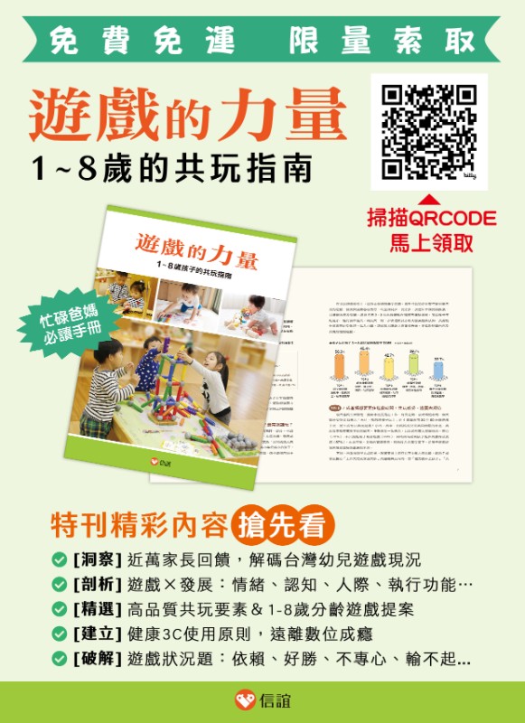 主旨:轉知信誼基金會出版《遊戲的力量:1-8歲孩子的共玩指南》特刊,即日起提供【免費免運贈送】歡迎家長線上索閱。 三、《遊戲的力量:1-8歲孩子的共玩指南》特刊精彩內容: ‧[洞察]近萬家長回饋,解碼台灣幼兒遊戲現況