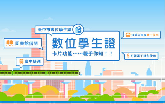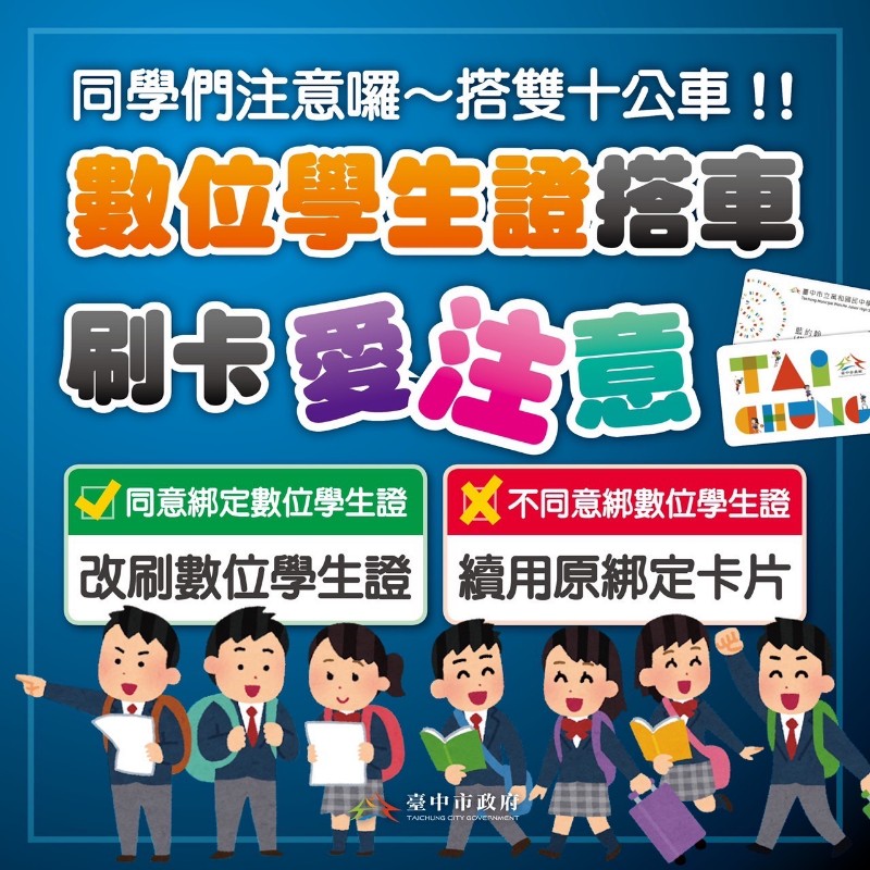 %權益篇 Q1:數位學生證有什麼功能? A1:本市數位學生證除學生身分識別,並提供學校內圖書借閱(限教育部全國閱讀推動與圖書管理系統)、本市立圖書館及國立公共資訊圖書館圖書借閱、本市大眾運輸交通乘車優惠、悠遊卡電子票證等功能。 Q2:持本市數位學生證搭乘本市大眾運輸,可享有哪些交通乘車優惠? A2:配合本市交通局市民限定乘車優惠,持數位學生證搭乘本市公車可享雙十優惠(10公里免費+超過10公里車資上限10元),國小數位學生證亦享有搭乘臺中捷運5折優惠。 Q3:如已同意綁定本市交通乘車優惠功能於數位學生證,那之前已綁定乘車優惠之電子票證(卡片)還可以繼續使用嗎? A3:因應本市交通卡作業要點一人限綁一卡之規定,如綁定交通乘車優惠功能於數位學生證,該優惠則轉移至數位學生證,請於領取數位學生證後,使用該證搭乘本市大眾運輸工具以享有相關優惠。 Q4:如何申請本市數位學生證? A4:本市所屬學校新生、轉入生統一由學校申請發放,並將由市府公費製發,倘有卡片遺失或損毀之情形,須自費進行換補發。 Q5:如何查詢所持有卡片相關資訊? A5:如欲查詢卡片狀態可至「臺中市數位學生證雲端卡務系統」https://stcard.tc.edu.tw 點選「卡片查詢」進行查詢。 Q6:如欲更改數位學生證相關服務功能(原先為不記名之數位學生證欲享有其它服務),應如何處理? A6:持卡人可選擇自費重新辦卡或依需求自行持既有數位學生證個別至以下地點辦理: ◆本市交通乘車優惠:請至本市公告之 94 個綁卡點進行綁卡,綁卡地點請洽 https://idoor.taichung.gov.tw/ 網站查詢。 ◆本市圖書借閱:請至本市立圖書館/國立公共資訊圖書館進行卡片綁定作業。 ◆悠遊卡電子票證記名:請至悠遊卡電子票證網站進行記名申請 https://ezweb.easycard.com.tw/eccl2/apply.action 。 Q7:如已綁定本市交通乘車優惠功能於數位學生證,欲轉移該優惠至其他卡片使用時,應如何處理? Q7:請自行至「臺中市數位學生證雲端卡務系統」https://stcard.tc.edu.tw 點選「卡片查詢」申請取消作業,一經確認取消,此張數位學生證以及爾後再重新申請(遺失補發、轉學換發)之數位學生證則不再享有本市交通乘車優惠功能,俟後如欲享有本市交通乘車優惠需另行備卡至本府交通局所規定之綁卡點進行綁定作業。 Q8:收到數位學生證之後,如果無法使用該如何處理? A8:如經初步檢查判斷數位學生證外觀無明顯毀損、彎曲、刮痕或折痕等情形,但仍無法進行感應、儲值及刷卡等動作,請自行至「臺中市數位學生證雲端卡務系統」https://stcard.tc.edu.tw 點選「卡片查詢」,下載及填報卡片異常處理單,並連同卡片寄至印卡中心,將由相關服務人員協助處理後續事宜。