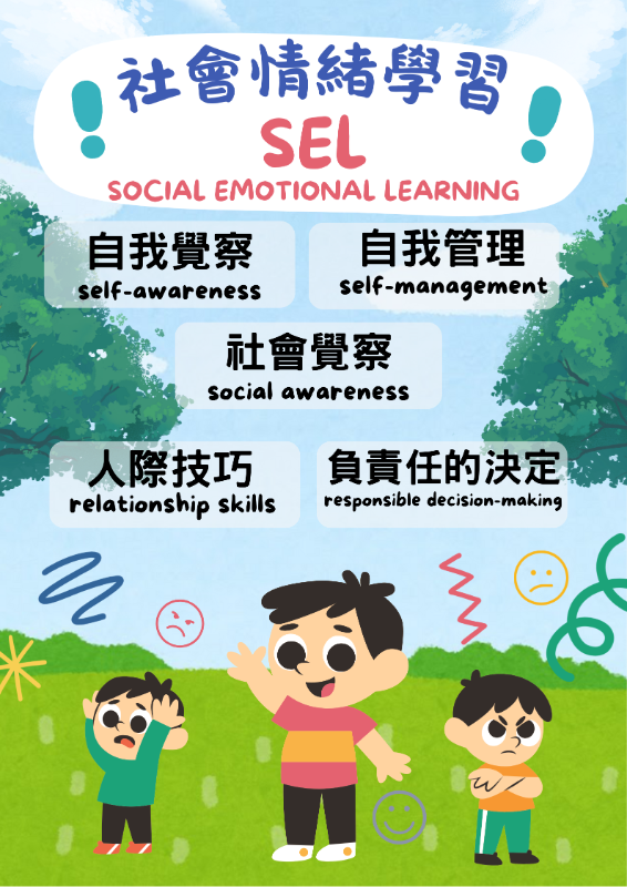 社會情緒學習(SEL)是什麼?社交情緒學習(Social & Emotional Learning),由美國「課業、社交與情緒學習組織」(CASEL)提出的概念,是情緒教育的一種,包含理解自己和他人的情緒、處理壓力、同理與社交能力。從最基本的自我認識開始,了解自己的直覺反應、自我發展,再傾聽的情緒與表達,最後與社會及他人的互動合作。 SEL不只是一堂課,更重視營造一個環境來達到同理、尊重、關懷與愛。除了EQ所強調的情商、情緒之外,也重視人與人的互動,以及達成個人目標。 社會情緒學習(SEL)5項內涵1.自我覺察(self-awareness):認識自己,能夠覺察自己的情緒、清楚自己的優缺點、價值觀與能力,並且了解對別人的影響。「自我覺察」的核心能力分別是:第一、自我覺察情緒的自我覺察:能夠覺察與辨識自己的情緒,並且明白情緒如何影響我。第二、身份認同與自我認識:意思是理解並且接納自己的優缺點、價值觀、偏見和刻板印象。第三、成長心態和目標:能看見自己在工作、家庭等不同群體裡的價值、定位,並且相信自己的未來操之在己。 2.自我管理(self-management):具備執行一件事所需的能力,在過程中能克服壓力或挫折,並且適時的自我激勵。「自我管理」的核心能力有:第一、情緒管理:在感到挫折、壓力和緊張時,能讓自己恢復平衡,並且不會對他人造成負面影響。第二、動機、自主性和目標設定:能設定有挑戰、可達成的目標,並且有清楚的步驟來達成目標。第三、計畫與組織:能夠根據資訊和現實修正計畫,並且具備專注力來完成目標。 3.社會覺察(social awareness):尊重不同文化、場域下的規範與差異;理解與尊重不一樣的人,展現同理心與關懷。「社會覺察」的核心能力分別是:第一、同理與慈悲心:能覺察他人的感受,關心他人。第二、角色替代:能與來自不同家庭、文化、社會背景,乃至於懷抱不同觀點的人學習。第三、理解社會情境:理解、欣賞並尊重不同社會規範、文化差異。 4.人際技巧(relationship skills):能和不同的人或團體,建立並維持長久、正向的關係,創造共好的環境。「人際技巧」的核心能力有:第一、溝通:能夠專心傾聽別人說話,並且真誠表達。第二、建立關係和團隊合作:能和不同文化、社會背景的人建立融洽的合作關係。第三、衝突管理:遇到衝突時能夠傾聽各方感受,並且表達自己的感受與觀點,努力讓事情變好。 5.負責任的決定(responsible decision-making):能綜合考量各種利益關係,做出行動與決策,並在下決定後願意接受、承擔結果。「負責任的決定」的核心能力有:第一、問題分析:能收集訊息、探究問題的原因。第二、提出解決方案:能為問題想出多種解決方案,並且預測結果。第三、反思:為了使自我和群體變得更好,在做決定的過程中會願意花時間反思所做的決定如何影響他人生活。 相關學習資源: 1.《情緒大飯店》繪本(書展期間將放置圖書室供班級共讀) 線上說繪本影片連結:https://youtu.be/gWjpiFfwJh4 https://youtu.be/a-a7SubJ_WE?si=aT32Z1L0H3H65WGD 2.班級引導PPT: 3.班級引導學習單:(可自行下載修改使用) 4.社會情緒學習5大內涵海報: