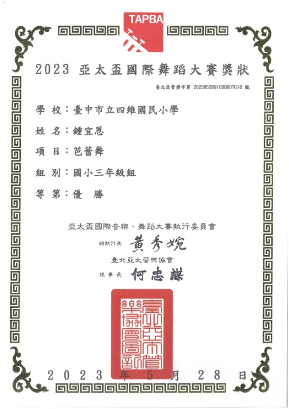 賀!鍾宜恩同學參加2023年亞太盃國際舞蹈大賽獲得國小三年級組優勝!