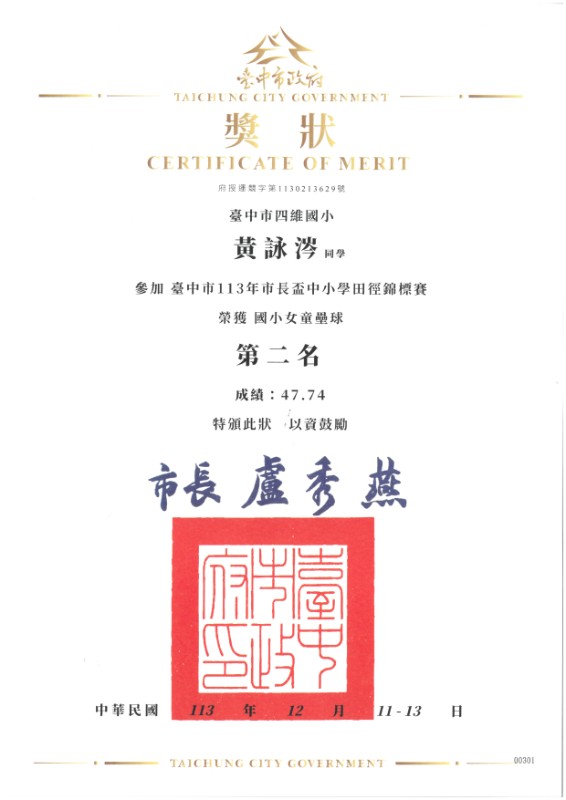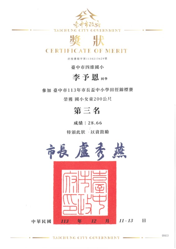 賀!田徑隊參加臺中市113年市長盃中小學田徑錦標賽,黃詠涔獲得女子壘球第二名,李予恩獲得女子200公尺第三名!