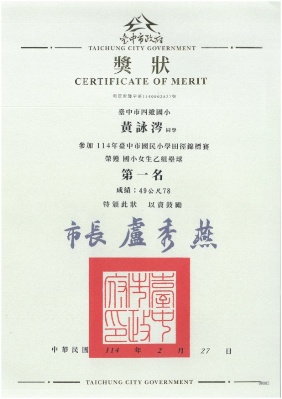 賀!黃詠涔同學參加114年臺中市小學田徑錦標賽榮獲女子壘球冠軍!