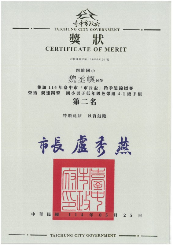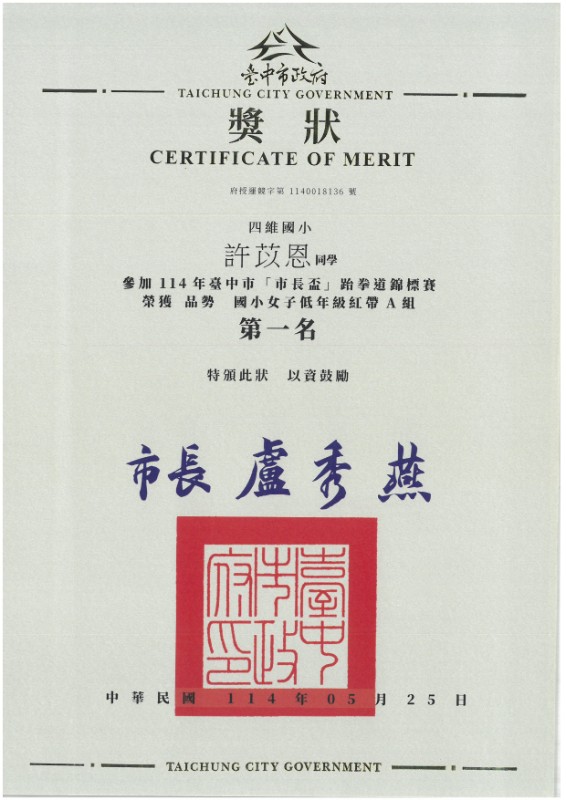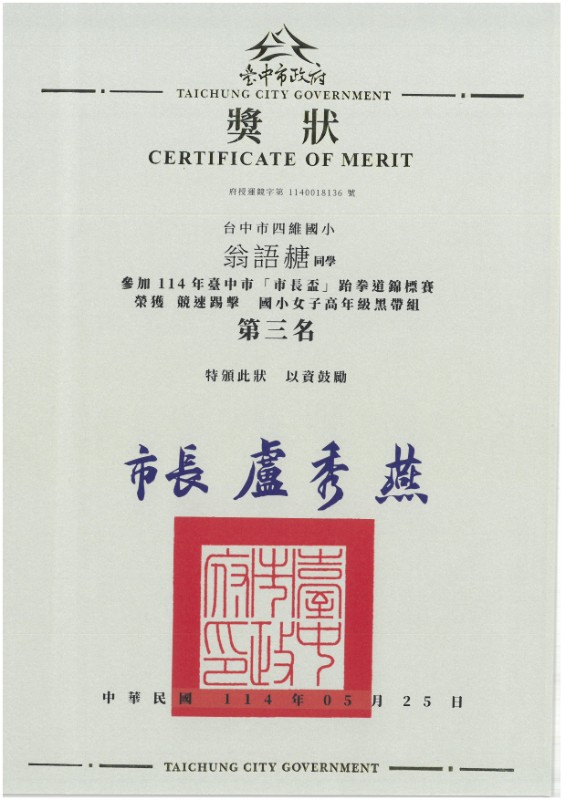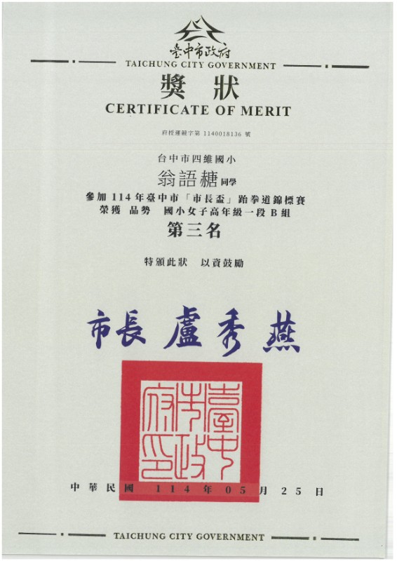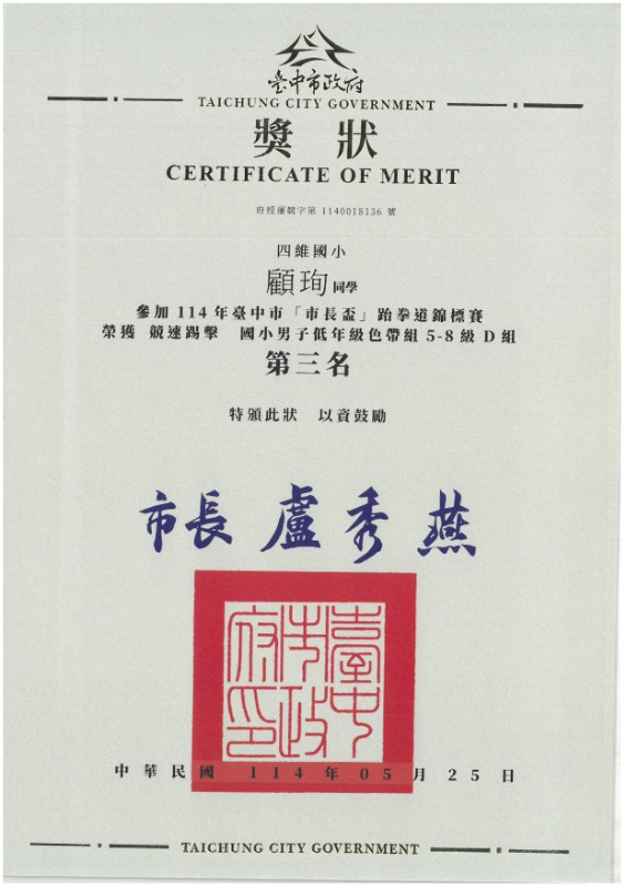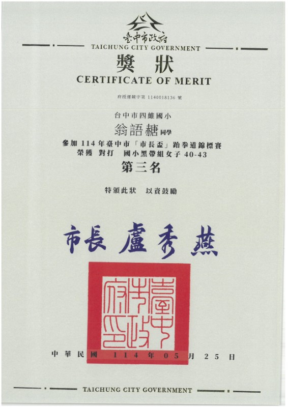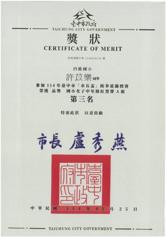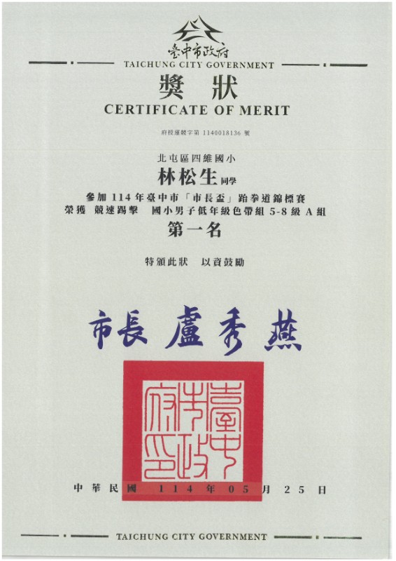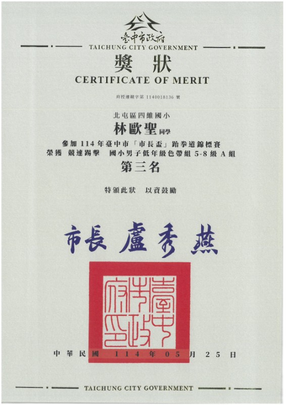 | 標題 | 賀!本校學生翁語赯 林松生 林歐聖 許苡恩 許苡樂 魏承嶼 顧珣 參加114年市臺中市市長盃跆拳道錦標賽榮獲優異成績! |