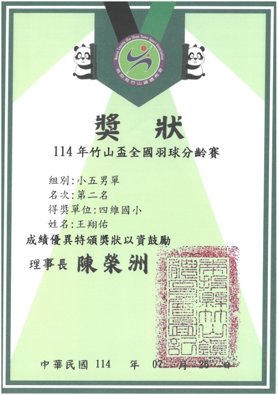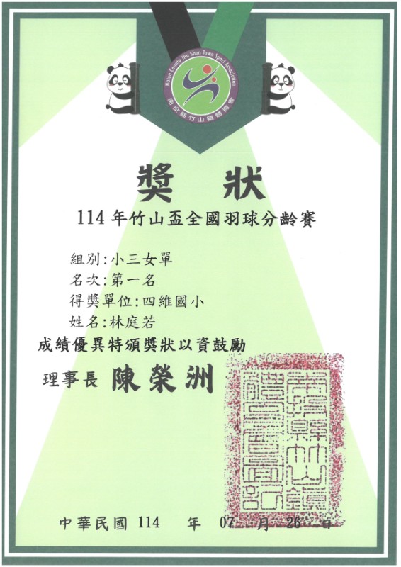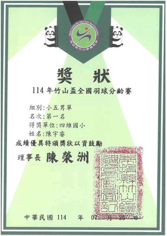陳宇睿 五年級男單 第一名 王翔佑 五年級男單 第二名 楊硯騰 四年級男單 第一名 林庭若 三年級女單 第一名 尤梓芯 二年級女單 第三名 |
