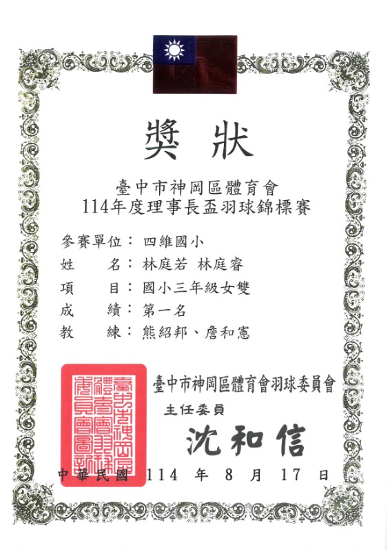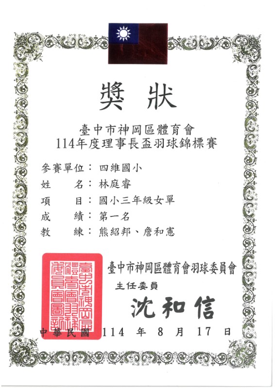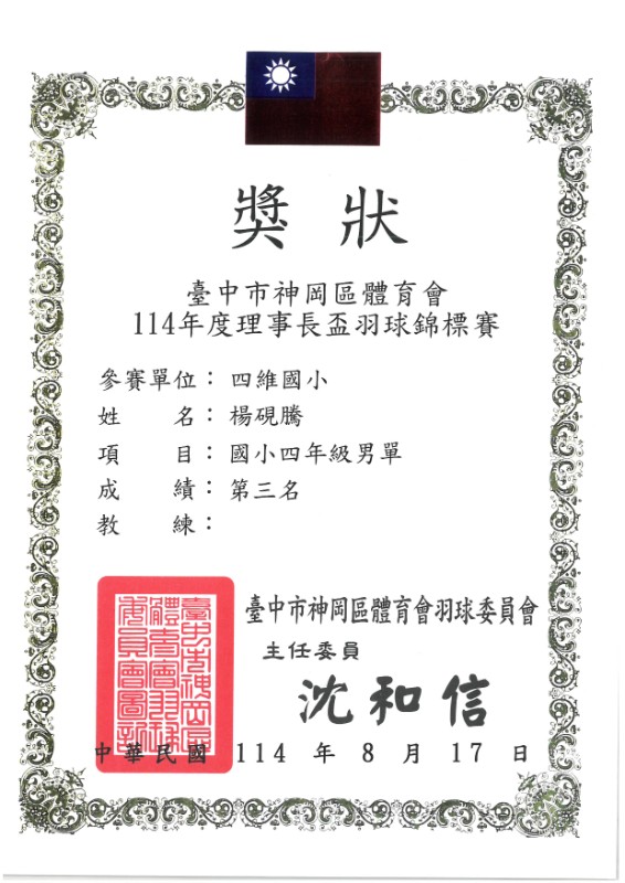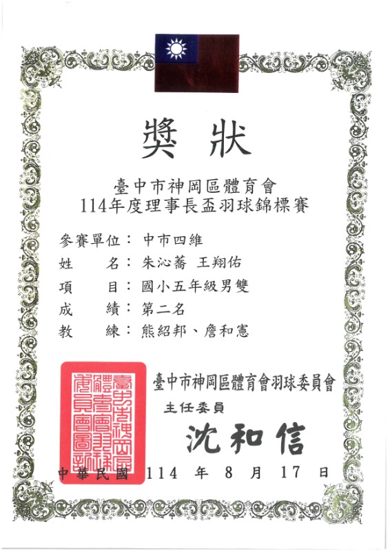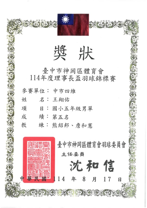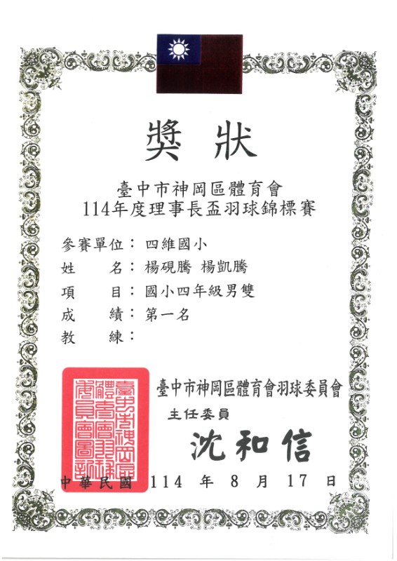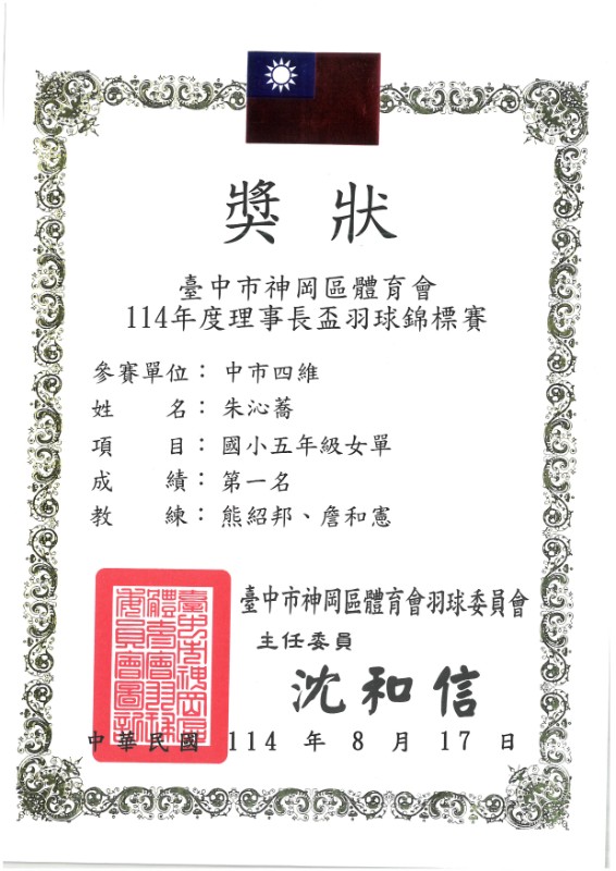 | 標題 | 賀!羽球隊參加114年臺中市神岡區理事長盃羽球錦標賽獲得優異成績! |