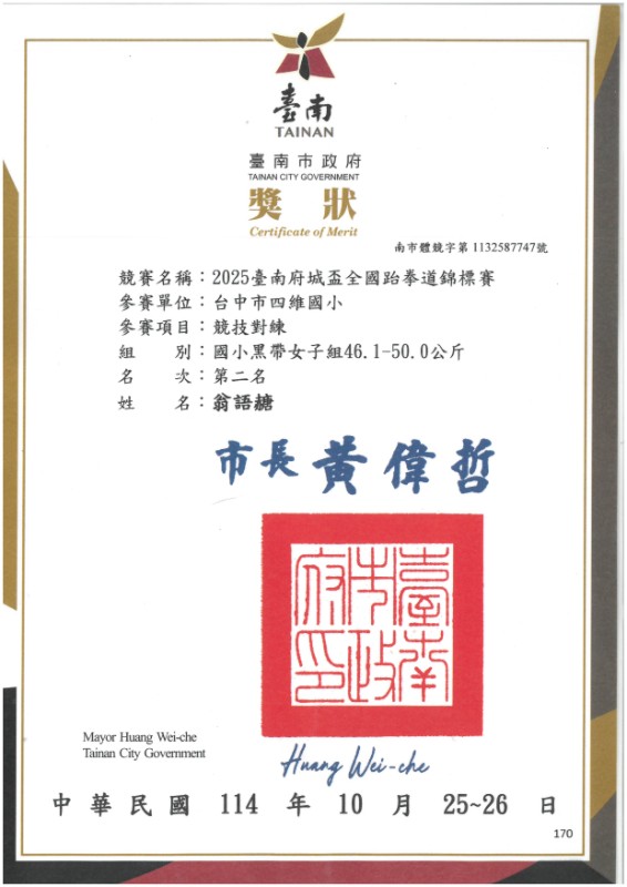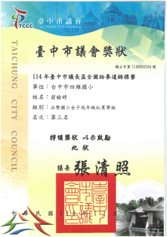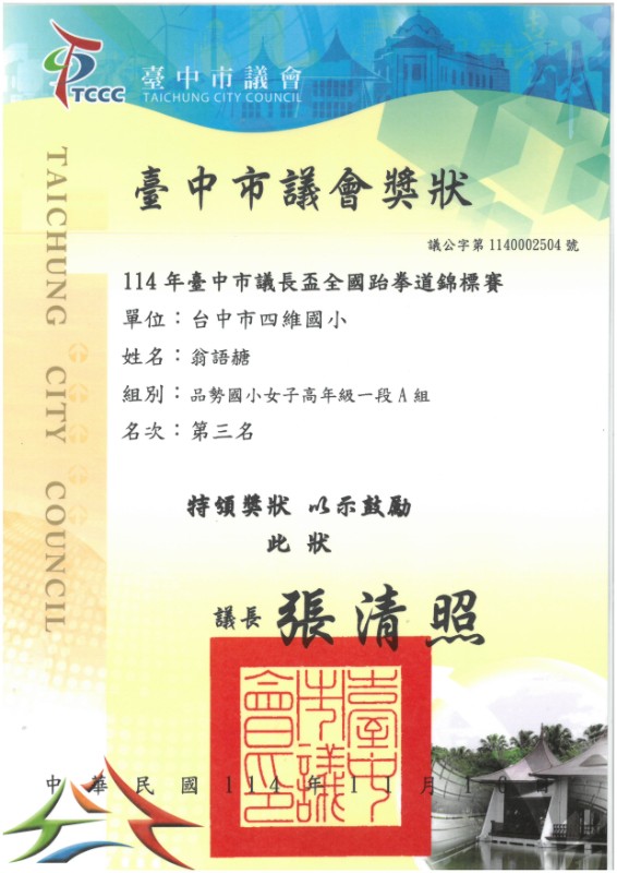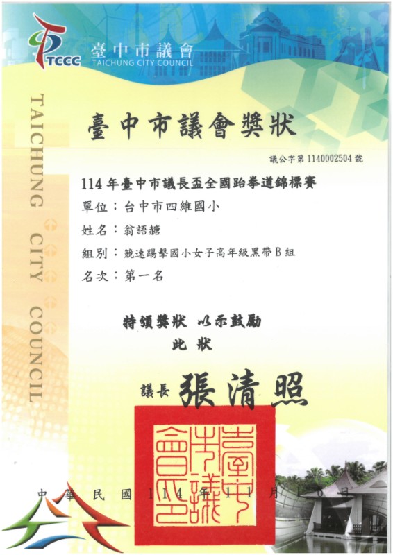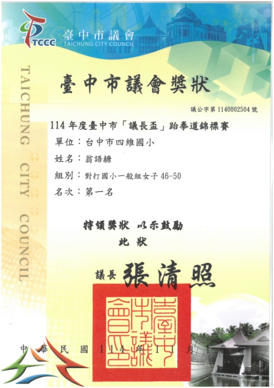 | 標題 | 賀!翁語赯、翁榆婷參加臺中市議長盃及臺南市府城盃跆拳道錦標賽獲得佳績! |