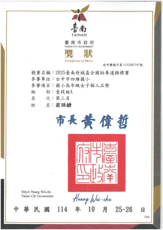 2025臺南市府城盃全國跆拳道錦標賽 翁語赯 競技對練國小黑帶女子組46.1-50公斤 第二名 競速踢擊國小女子高年級色帶黑帶 第一名 國小高年級女子個人品勢一段組A 第三名