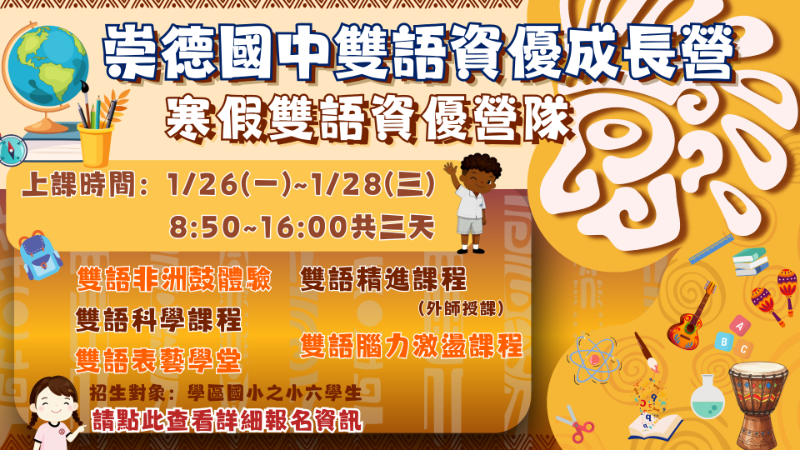 說明: 一、為協助國小六年級學生提早熟悉國中學習環境、降低轉銜焦慮,並鼓勵學生適性探索多元興趣,本校規劃「寒假雙語資優主題營隊」及「資優菁英課程班」,提供學生多面向的學習體驗。 二、相關課程內容與辦理方式,請見崇德國中首頁。 |