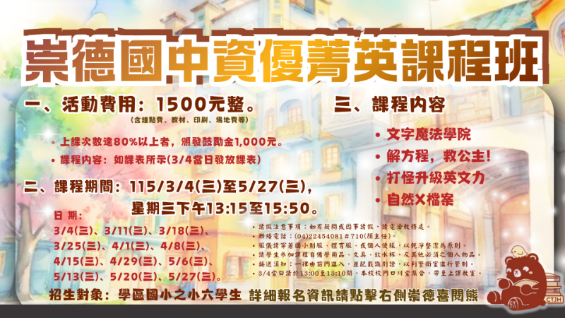 | 標題 | 轉知:臺中市立崇德國民中學辦理「115年度資優成長系列營隊」 |